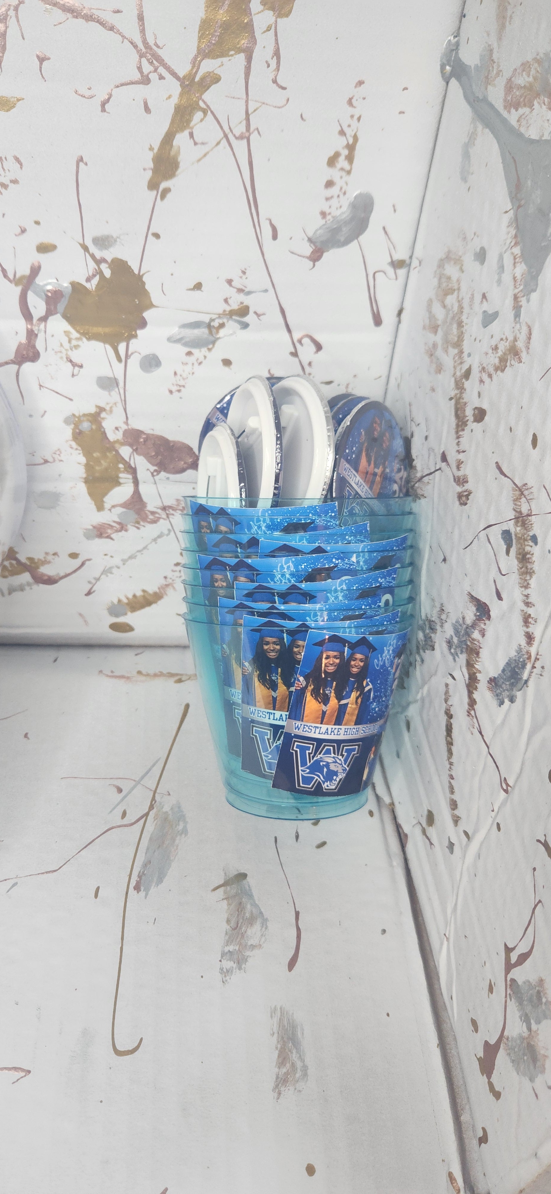Get ready to celebrate with the Grad Bundle! This amazing package comes with 6 custom fans, 10 custom clear plastic cups, 1 clear plastic bucket, and 8 3inch custom buttons, all personalized with your name and school colors. With this bundle, you'll have all the essentials for a fun and memorable graduation celebration! Don't forget to send us photos of the festivities - we love seeing our customers in action! Thank you for choosing the Grad Bundle.